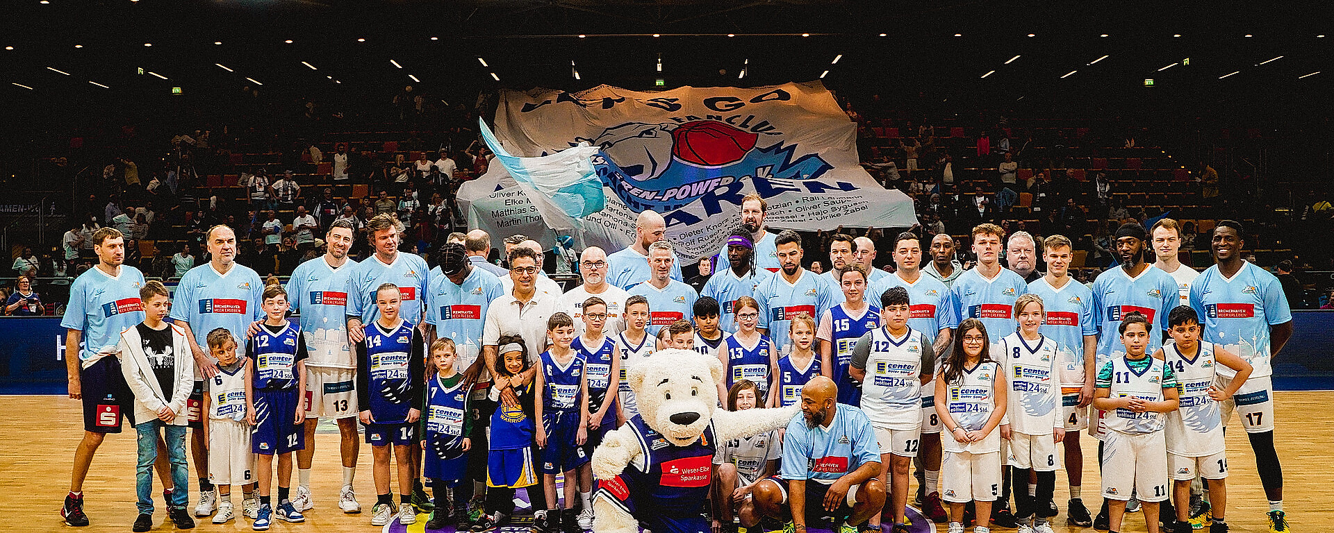 Schon der Einlauf der beiden Teams war ein besonderes Highlight. Mit vielen ehemaligen Mitgliedern hatte das Danceteam ordentlich aufgestockt und schuf den besonderen Rahmen für die Rückkeht der All-Stars. Den Sprungball des All-Star Games konnte Axel Pleuger mit dem Sohn von Coach Hamet Attarbashi auf den Schultern für sein Team entscheiden. Die Zuschauer auf den Rängen bejubelten jede Aktion der ehemaligen Profis und wurden mit einigen sehenswerten Treffern belohnt. In den Pausen zeigte das Eisbären Bremerhaven Danceteam mit seinen All-Stars und auch gemeinsam mit Torrell Martin noch einmal sein Können. Die letzten Punkte des Spiels gehörten Menno Möller, so endete die Partie mit 131:99 für das Team von Jan Lipke.